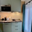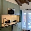 Cucina completamente attrezzata: piano cottura a induzione, frigorifero, microonde, macchina da caffè Dolce Gusto, stoviglie, utensili e lavastoviglie