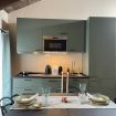 Cucina completamente attrezzata: piano cottura a induzione, frigorifero, microonde, macchina da caffè Dolce Gusto, stoviglie, utensili e lavastoviglie